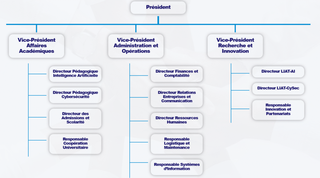Pour mener à bien ses missions et atteindre ses objectifs, LIAT adopte un modèle de gouvernance s’articulant autour de plusieurs directions, services et conseils qui œuvrent à la réalisation de fonctions bien précises, tant au niveau académique et scientifique qu’au niveau opérationnel.